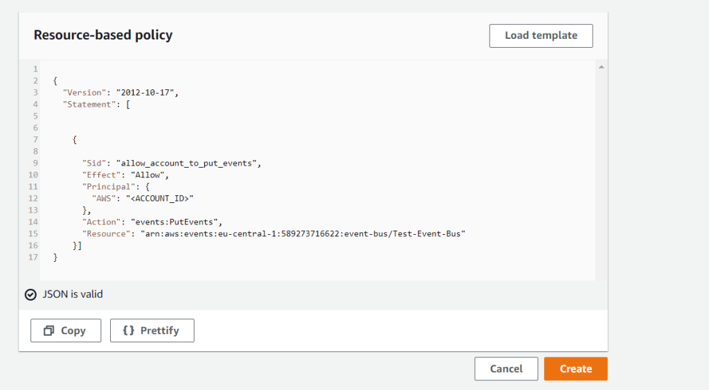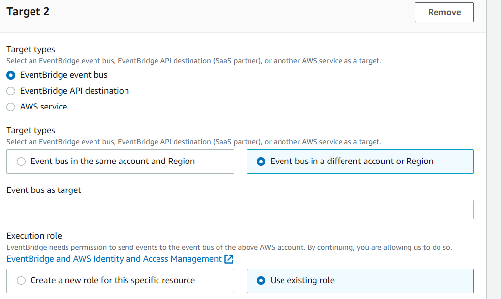 In child account, Create Master account EventBus as the target, paste the ARN taken from the previous step.