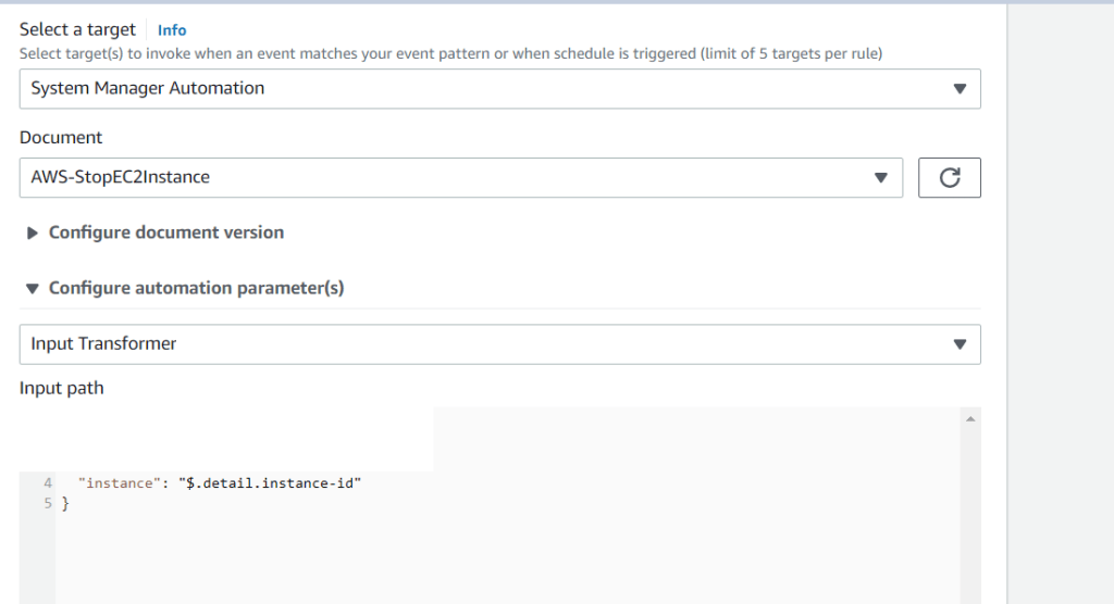 Select the target , In this case Automation document. Input transformer is used to filter out the data you wanted from the JSON (event JSON (in this case)
